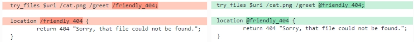 named location을 사용하면 rewrite후 re-evaluate를 생략한다. 따라서 바로 $freindly_404를 찾아서 return한다.