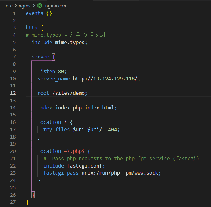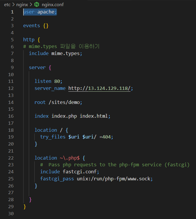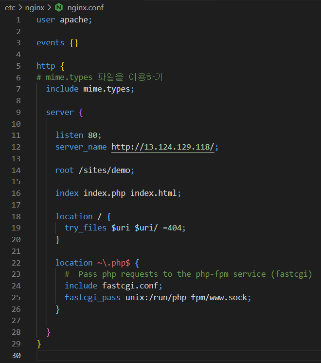 - nginx.conf을 수정하여 php-fpm을 연결하고
