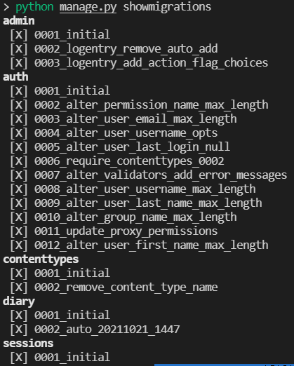 showmigrations으로 조회되는 내용이 무엇을 의미하는지 알 수가 없으니 함부로 행동할 수가 없다.