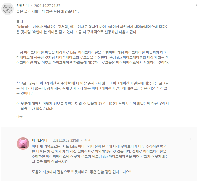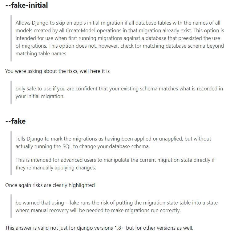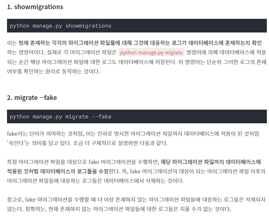 6. 위 게시글을 올린 사람은 목적 성취를 위해 'migrate --fake' 명령어를 이용하였는데 이게 무엇을 의미하는 걸까? 공식문서에는 추상적인 설명만 있어서 와닿지가 않는다.